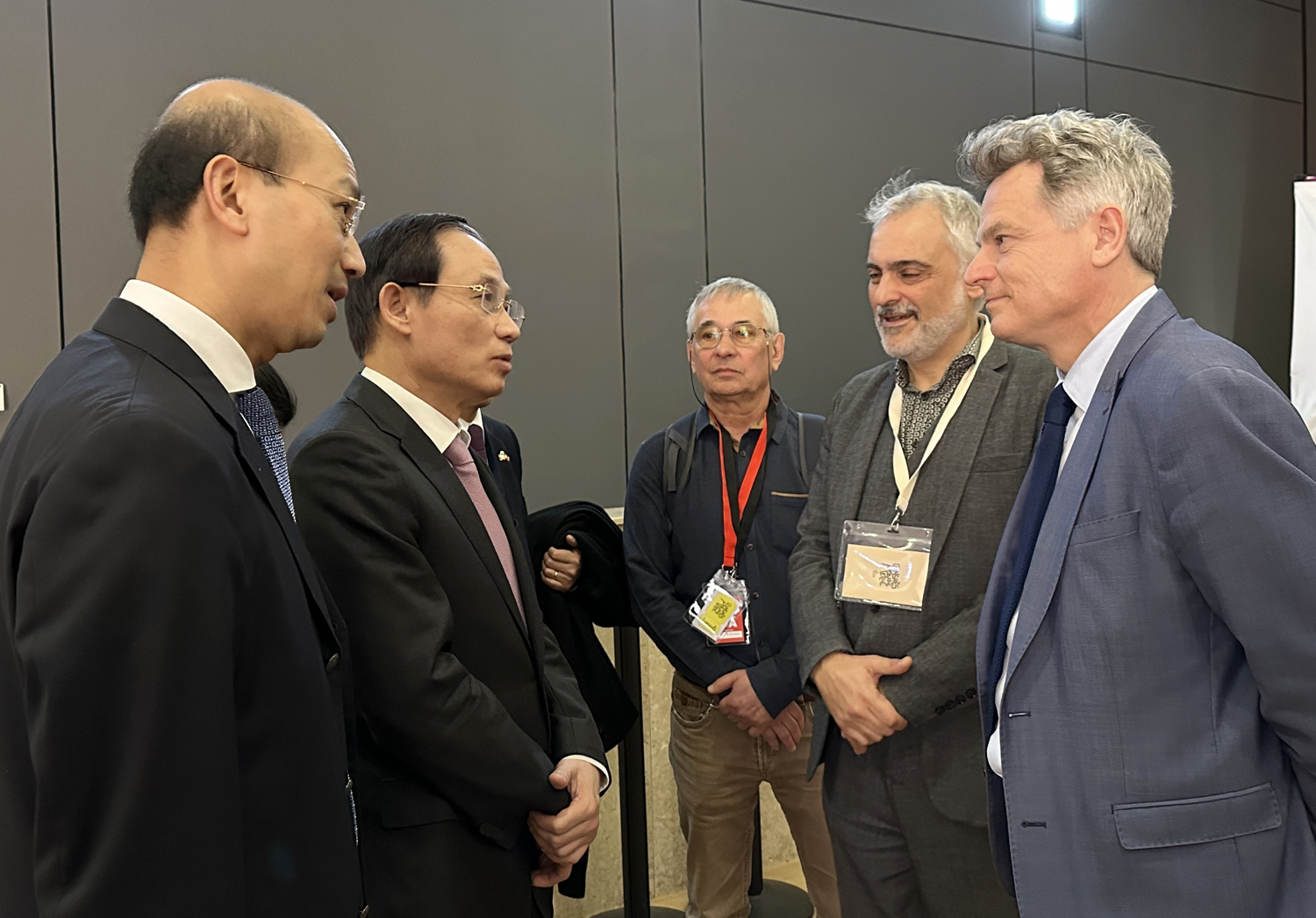Ủy viên Trung ương Đảng, Trưởng Ban Đối ngoại Trung ương Đảng Cộng sản Việt Nam Lê Hoài Trung (thứ hai, bên trái) trao đổi với đồng chí Fabien Roussel, Bí thư toàn quốc Đảng Cộng sản Pháp (thứ nhất, bên phải) tại Marseilles, bên lề Đại hội Đảng Cộng sản Pháp lần thứ 39, ngày 7-4-2023_Ảnh: TTXVN