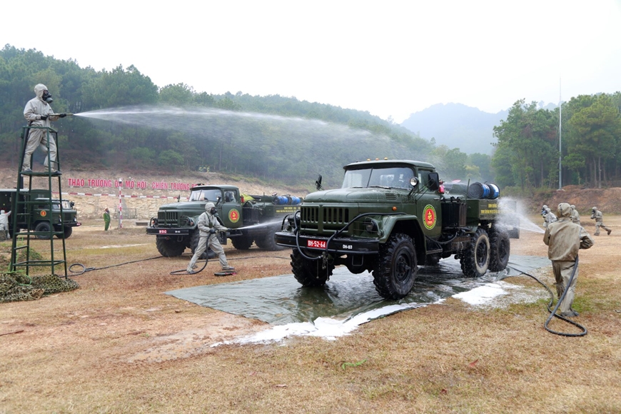 Bộ đội hóa học thực hành tiêu tẩy cho phương tiện trong diễn tập