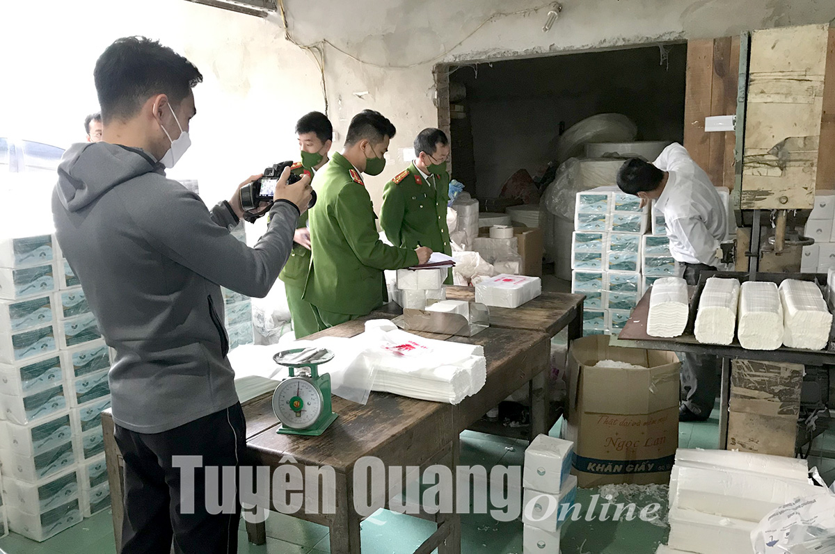 hòng Kỹ thuật hình sự, Công an tỉnh khám nghiệm hiện trường vụ sản xuất hàng giả tại phường Nông Tiến (TP Tuyên Quang).