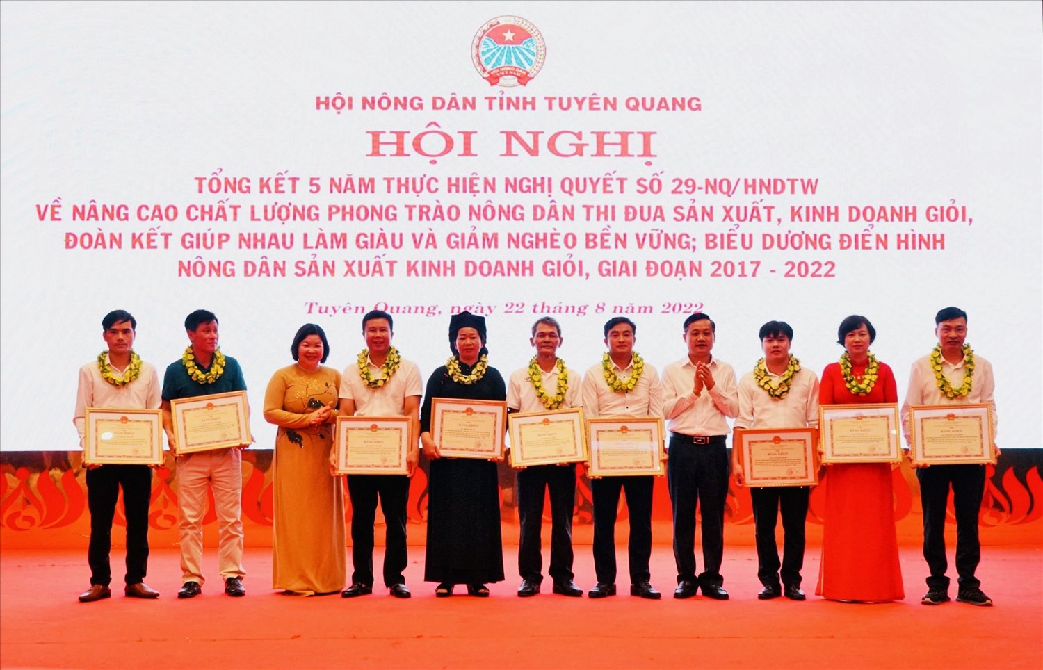 Lãnh đạo Trung ương Hội Nông dân Việt Nam, lãnh đạo Ủy ban Nhân dân tỉnh trao bằng khen cho các nông dân sản xuất, kinh doanh giỏi