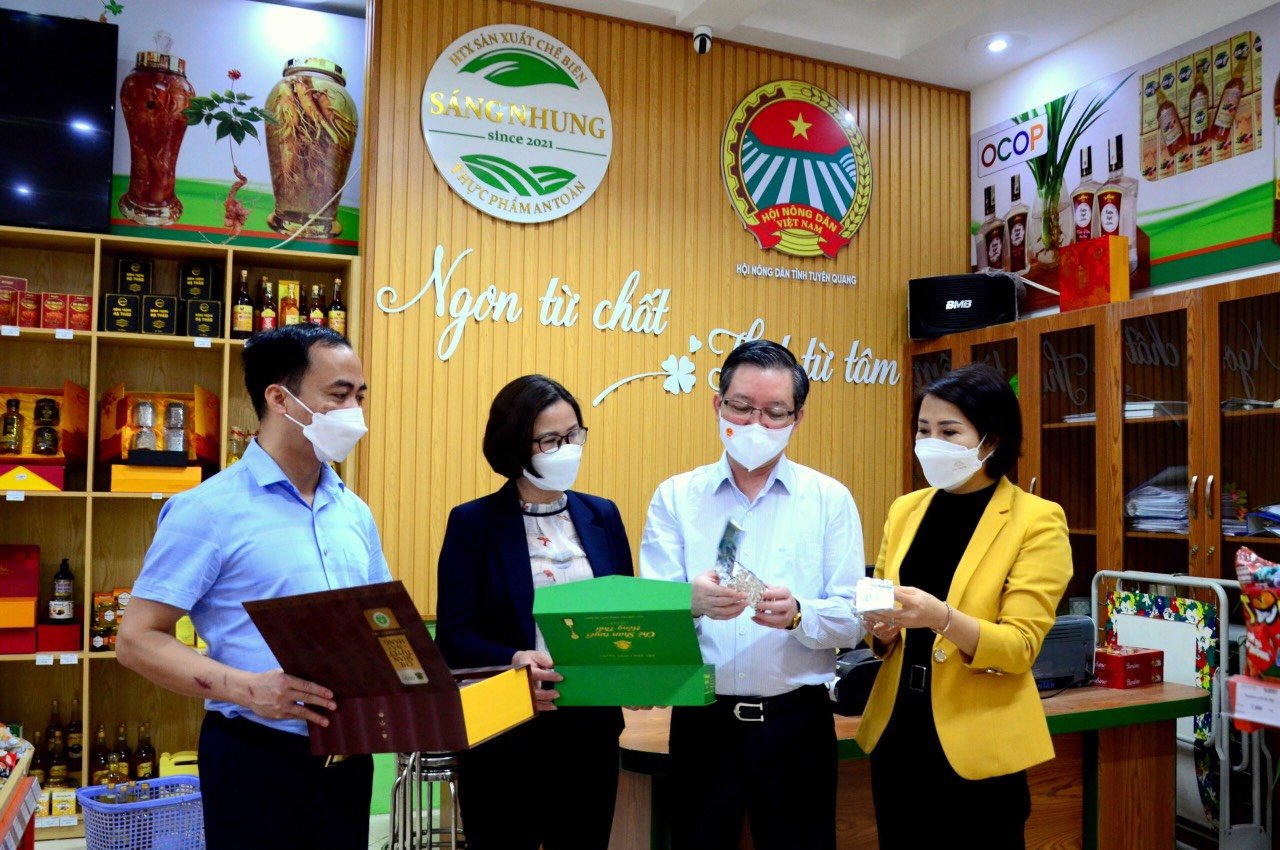 Ông Lương Quốc Đoàn chủ tịch Hội Nông dân Việt Nam thăm gian hàng sản phẩm OCOP Tuyên Quang