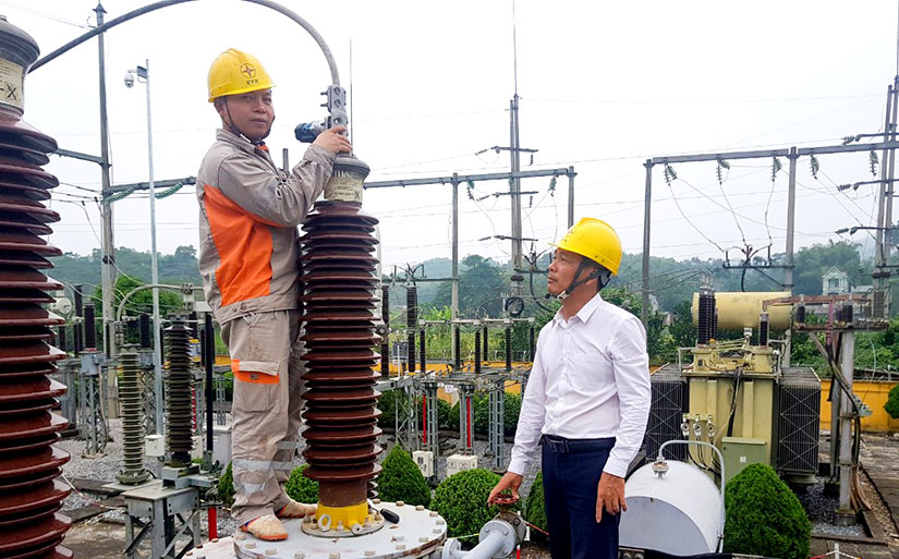 Công nhân Điện lực Tuyên Quang sửa chữa, bảo dưỡng trạm biến áp 110 kV Tuyên Quang, xã Lưỡng Vượng (TP Tuyên Quang).