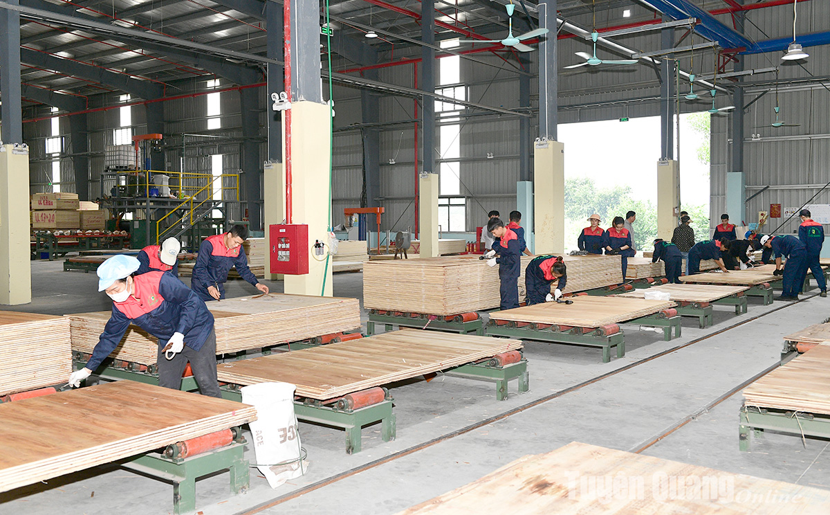 Công nhân Công ty TNHH Sao Việt Tuyên Quang sản xuất gỗ ép xuất khẩu.