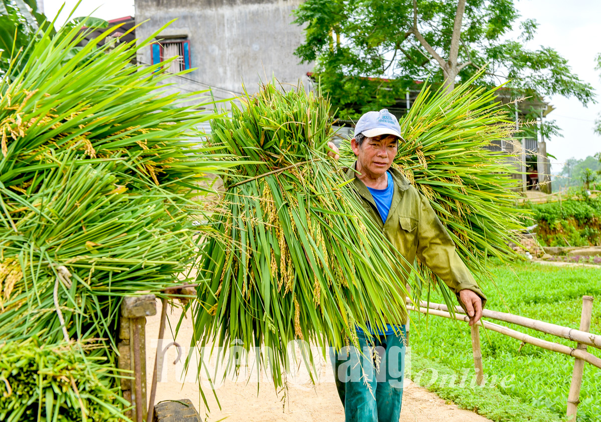 Người dân xã Hùng Mỹ (Chiêm Hóa) hối hả thu hoạch lúa xuân.