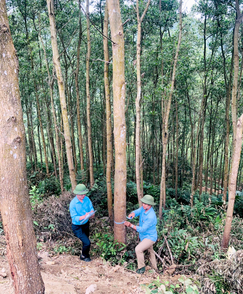 Cán bộ phòng Kế hoạch - Kỹ thuật, Công ty Lâm nghiệp Sơn Dương thiết kế rừng chuẩn bị kế hoạch khai thác.