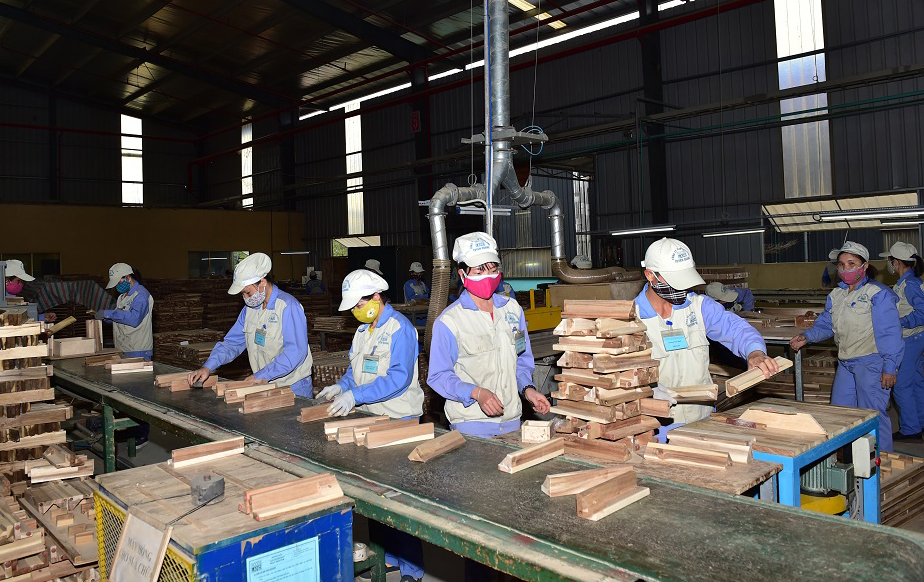 Công nhân Công ty cổ phần Woodsland Tuyên Quang vừa chống dịch vừa đẩy mạnh sản xuất ngay từ đầu năm. Ảnh: Thành Công