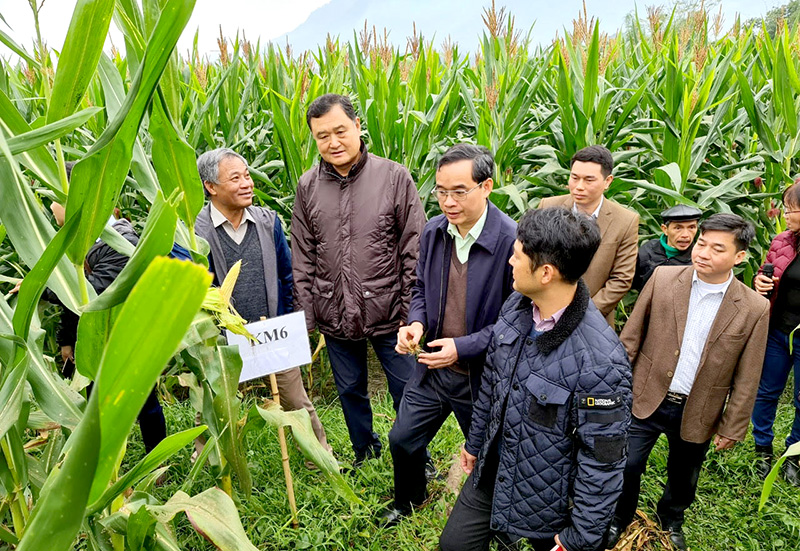 Lãnh đạo Sở NN và PTNT, Viện Cây lương thực và Cây thực phẩm cùng các chuyên gia thăm mô hình trồng ngô sinh khối tại xã Yên Nguyên (Chiêm Hóa).