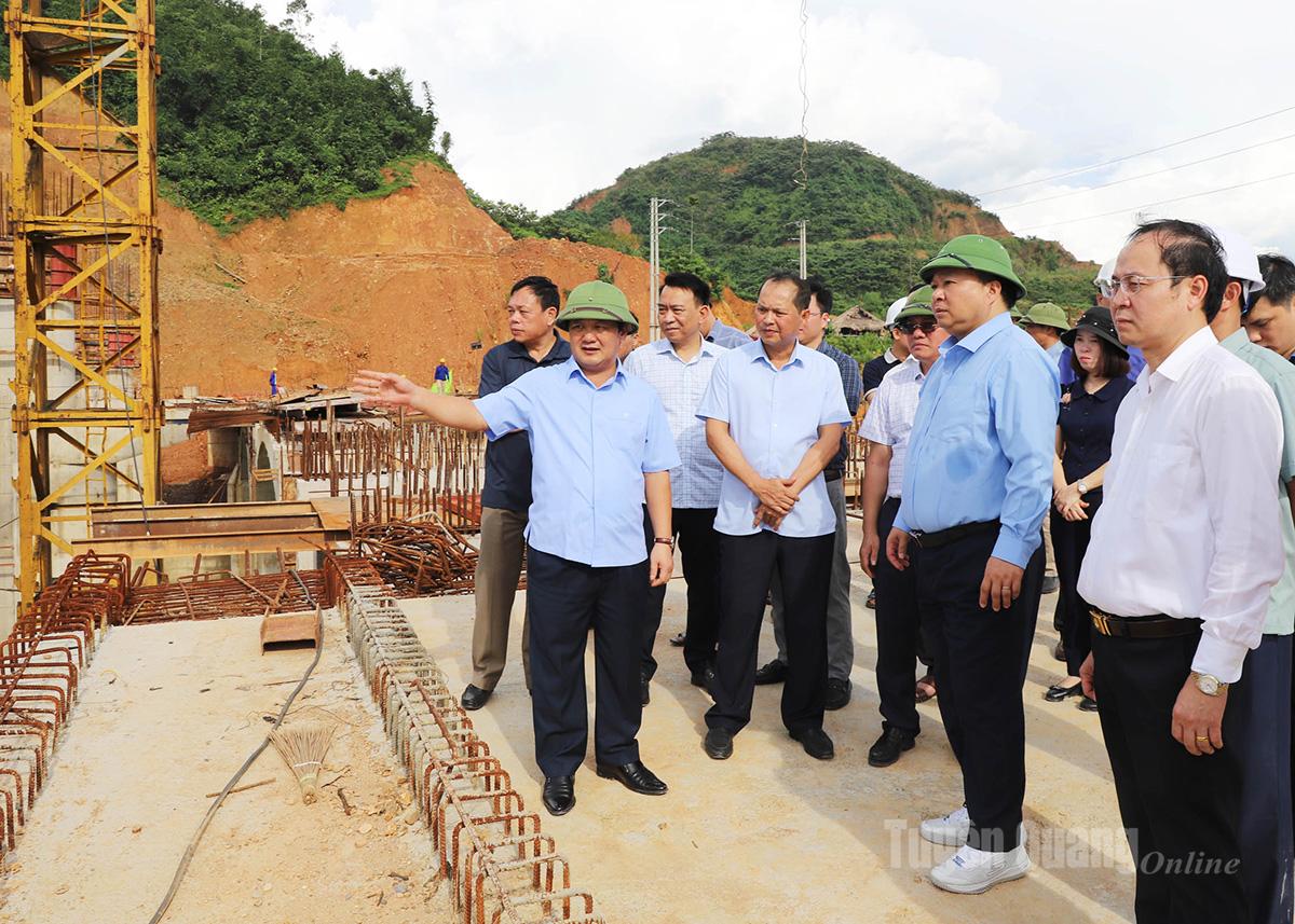Kiểm tra dự án Đập dâng nước tạo cảnh quan tại phường Hà Giang 1, được khởi công từ đầu năm 2023 với tổng mức đầu tư hơn 330 tỷ đồng. Đến nay, khối lượng xây lắp đạt gần 73% giá trị hợp đồng; đã giải ngân hơn 218 tỷ đồng, đạt 90% kế hoạch vốn đã bố trí. Bí thư Tỉnh ủy Hầu A Lềnh yêu cầu nhà thầu thực hiện khẩn trương các hạng mục đã được phê duyệt để đẩy nhanh tiến độ; thi công song song kè bờ sông với các hạng mục khác. Chủ đầu tư tiếp tục tăng cường giám sát, cập nhật tiến độ thi công chi tiết theo tuần, tháng. Khi thi công phải đảm bảo tuyệt đối an toàn, đảm bảo chất lượng và đúng tiến độ đã cam kết. Phấn đấu đưa công trình vào sử dụng, đáp ứng sự mong mỏi, kỳ vọng của người dân, chào mừng Đại hội toàn quốc lần thứ XIV của Đảng.