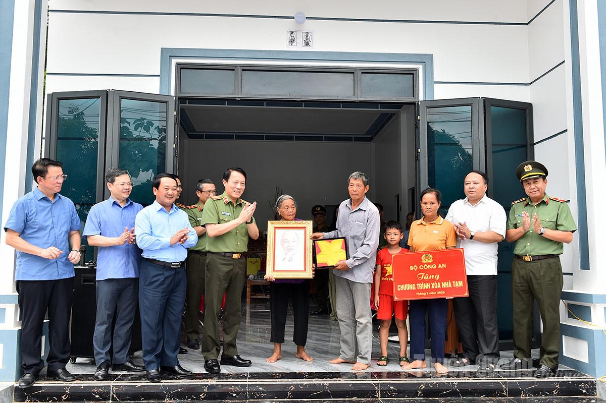| Đại tướng Lương Tam Quang, Bộ trưởng bộ Công an và các đồng chí lãnh đạo tỉnh trao hỗ hợ nhà và quà cho gia đình ông Nguyễn Văn Luận tại thôn Toa, xã Minh Thanh. |