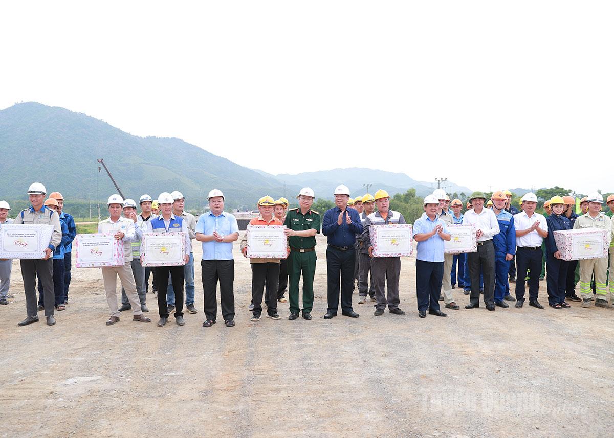 | Dịp này, Bộ trưởng Trần Hồng Minh, Bí thư Tỉnh ủy Hầu A Lềnh, Chủ tịch UBND tỉnh Phan Huy Ngọc tặng quà động viên các nhà thầu thi công. |