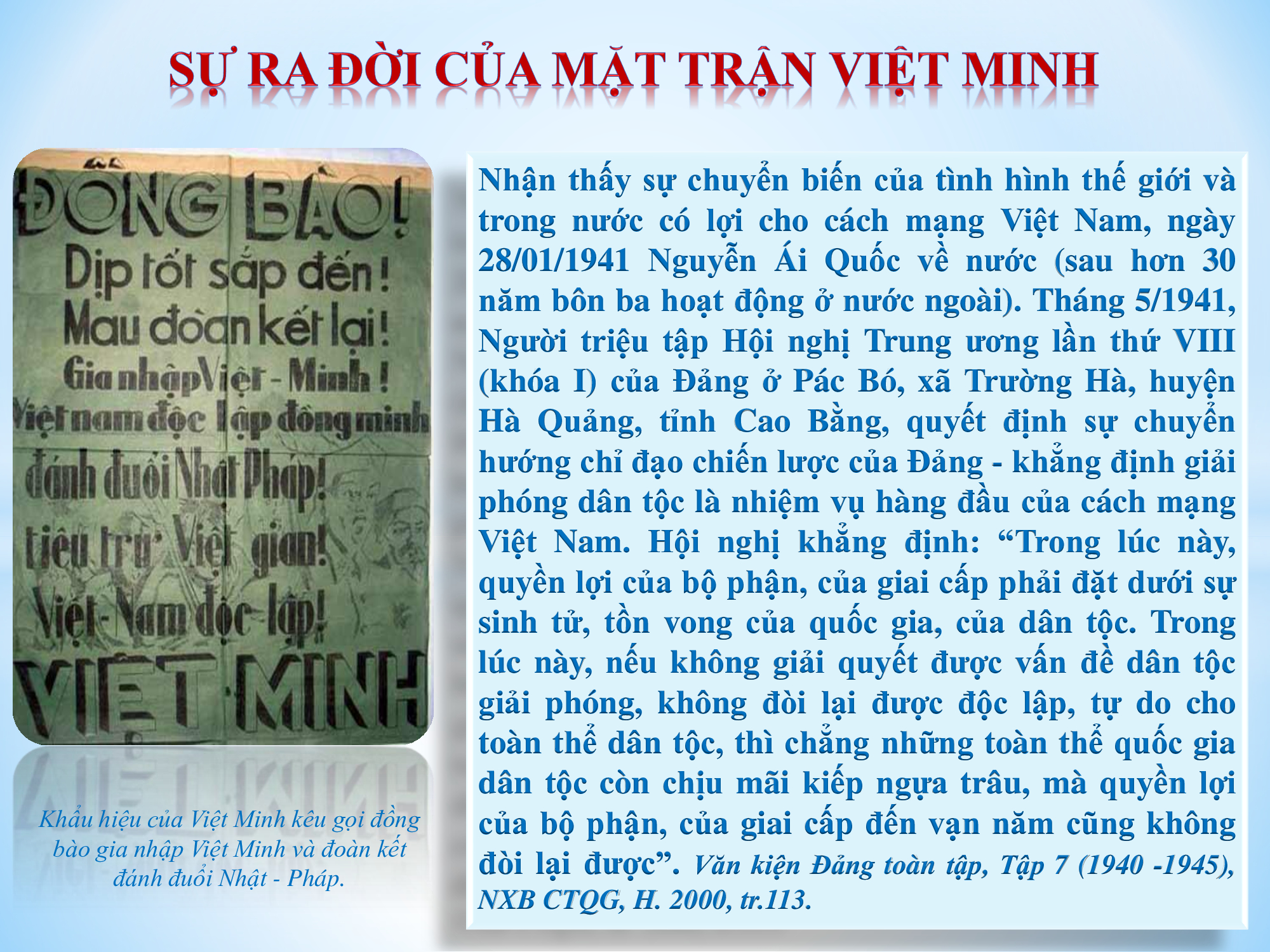 Ngày 19/5/1941, Mặt trận Việt Nam độc lập đồng minh (gọi tắt là Mặt trận Việt Minh) ra đời, thay cho Mặt trận Dân tộc thống nhất phản đế Đông Dương. Việc quyết định thành lập Mặt trận Việt Minh là một chủ trương hết sức sáng suốt của Trung ương Đảng và Lãnh tụ Nguyễn Ái Quốc, có ý nghĩa quan trọng vào sự phát triển phong trào cách mạng giải phóng dân tộc mà đỉnh cao là thắng lợi của Cách mạng tháng Tám năm 1945.