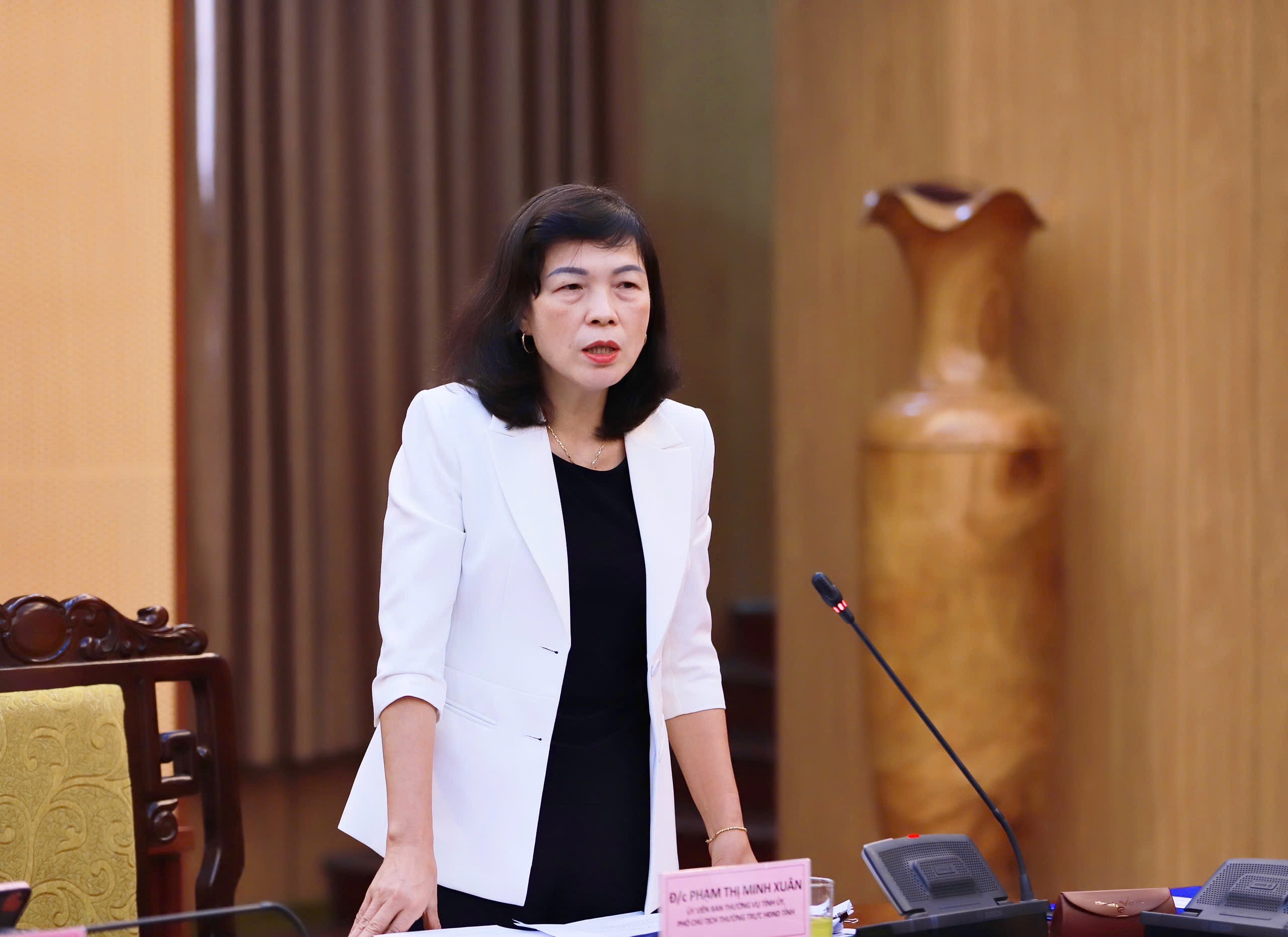 | Phó Chủ tịch HĐND tỉnh Phạm Thị Minh Xuân phát biểu tại phiên họp. |