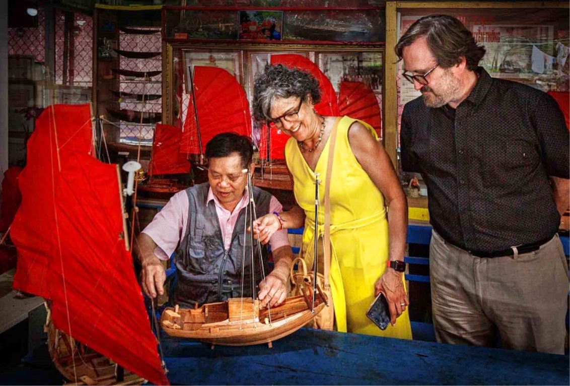Nhân dân giới thiệu quà tặng du lịch thuyền buồm ba vách Quảng Yên cho du khách (Nguồn: Dương Văn Toàn/ nhiepanhdoisong.vn)