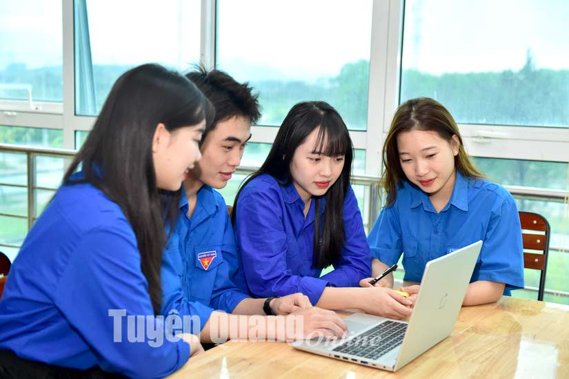 Sinh viên trường Đại học Tân Trào trao đổi, tìm hiểu cách phòng chống thông tin xấu độc trên mạng.