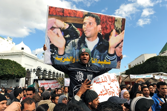 Người biểu tình giơ cao hình ảnh người bán hàng rong Mohamed Bouazizi tại Tunisia. Ảnh: New York Times