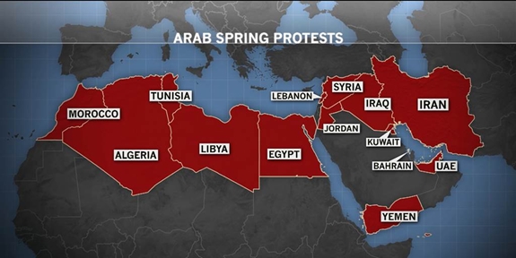 Việc chính quyền Tunisia và Ai Cập bị thay đổi trong thời gian ngắn được ví như con virus độc hại lan rộng tới các nước Trung Đông và Bắc Phi. Các thế lực bên ngoài nhân cơ hội này “đục nước béo cò” để hà hơi, tiếp sức với cái gọi là “dân chủ, tự do và một tương lai tươi mới”. Các cuộc biểu tình và nhiều hình thức như: Bất tuân dân sự, chống đối dân sự, nổi dậy, bạo loạn, vận động trên mạng xã hội, đình công, chiến đấu đô thị lan nhanh sang các nước lân cận như vết dầu loang: Algeria (29-12-2010), Jordan (14-1-2011), Oman (17-1-2011), Saudi Arabia (21-1-2011, các cuộc biểu tình phản đối chính thức bắt đầu diễn ra từ ngày 11-3-2011), Ai Cập (25-1-2011), Syria (26-1-2011), Yemen (27-1-2011), Djibouti (28-1-2011), Palestine (10-2-2011), Iraq (12-2-2011), Bahrain (14-2-2011), Libya (15-2-2011), Kuwait (19-2-2011), Morocco (20-2-2011), Lebanon (27-2-2011)...