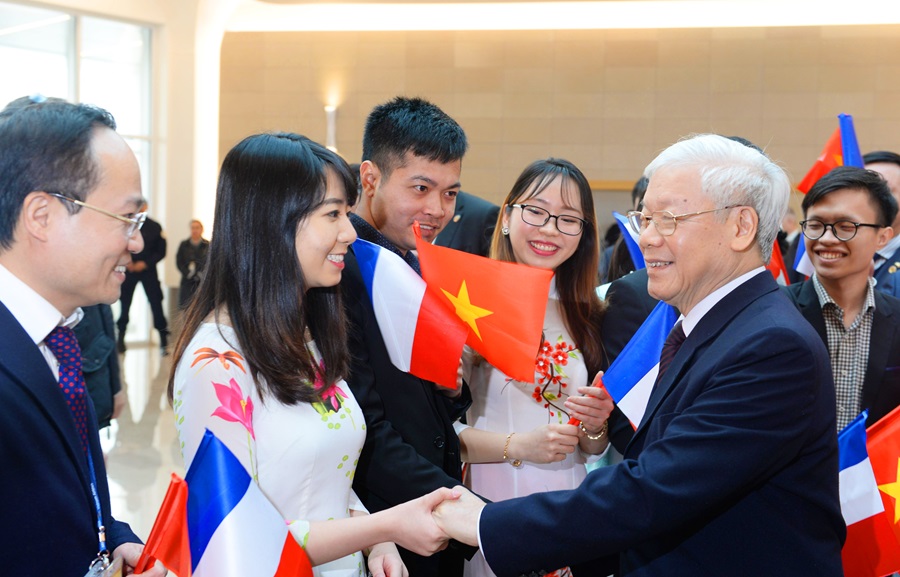 Tổng Bí thư Nguyễn Phú Trọng gặp gỡ trí thức trẻ Việt Nam tại Pháp (tháng 3-2018) _Ảnh: qdnd.vn