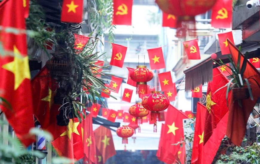 Một ngõ ở trung tâm thành phố Hà Nội được trang trí cờ Tổ quốc, cờ Đảng, chào mừng kỷ niệm 95 năm Ngày thành lập Đảng Cộng sản Việt Nam. Ảnh: hanoimoi.vn