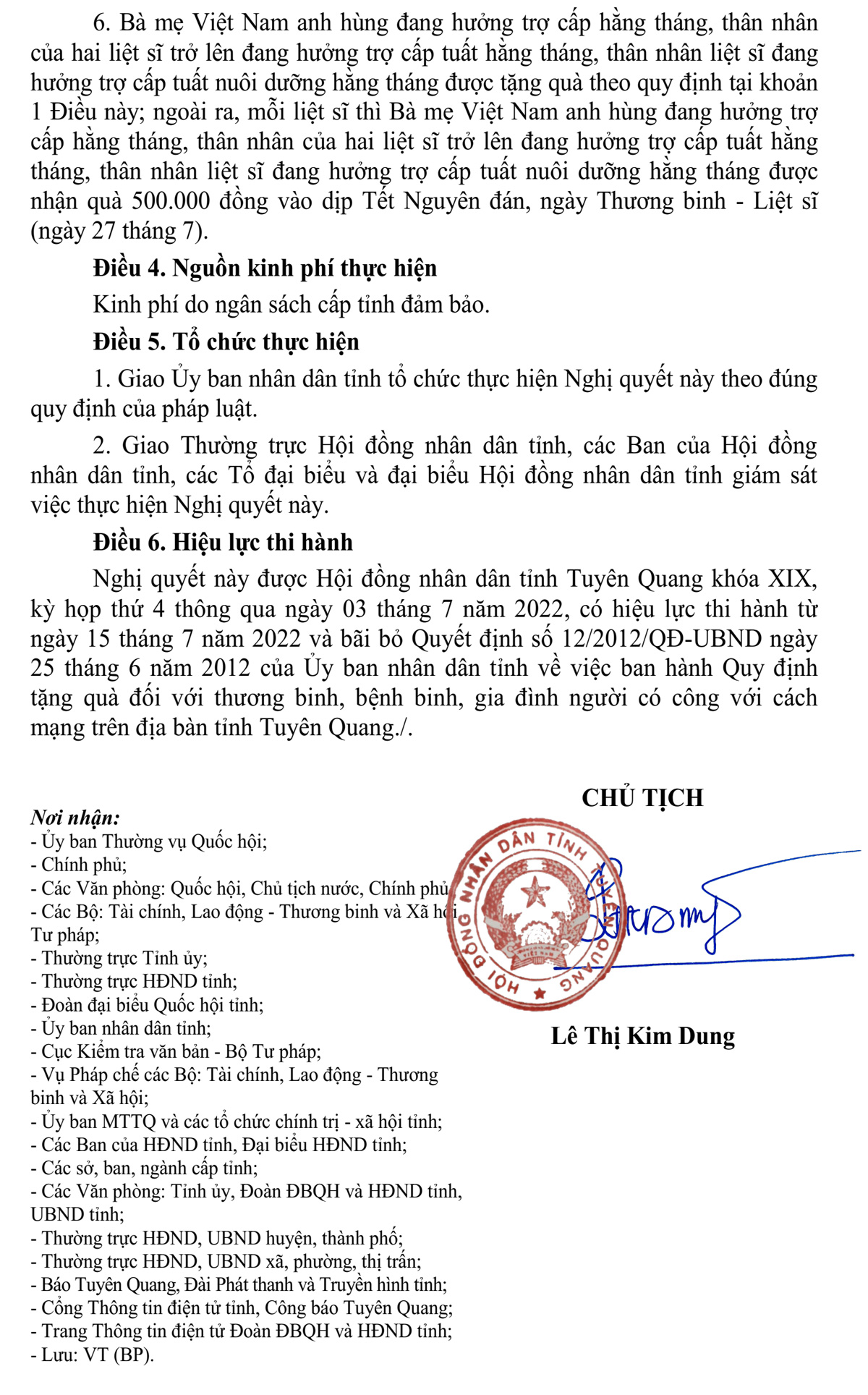 Nghị quyết này có hiệu lực thi hành từ ngày 15-7-2022 và bãi bỏ Quyết định số 12/2012/QĐ-UBND ngày 25-6-2012 của UBND tỉnh về việc ban hành Quy định tặng quà đối với thương binh, bệnh binh, gia đình người có công với cách mạng trên địa bàn tỉnh Tuyên Quang.