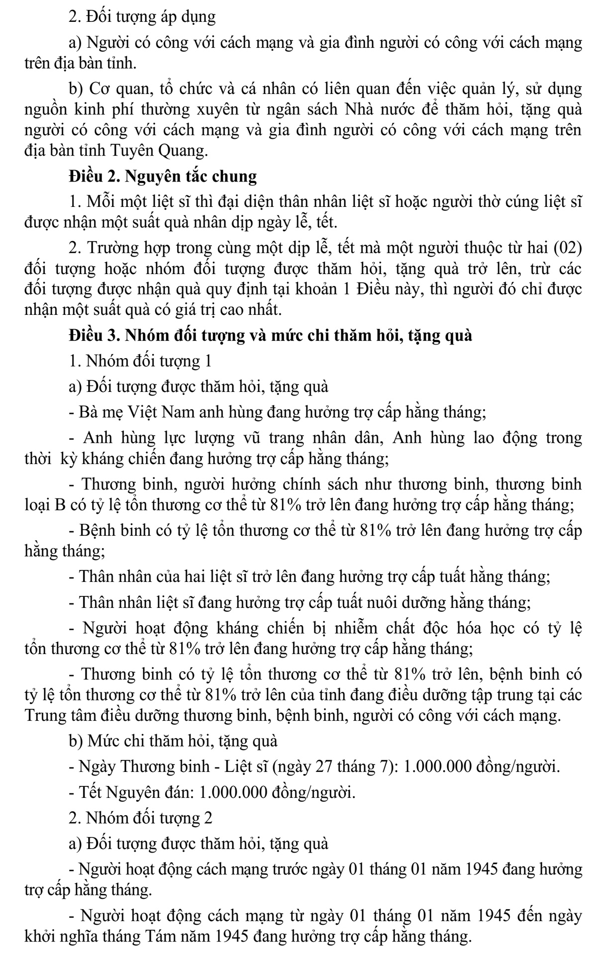 Nhóm đối tượng được thăm hỏi, tặng quà chia thành 4 nhóm (chi tiết tại văn bản bản kèm theo). Các mức chi thăm hỏi, tặng quà cụ thể như sau: Nhóm đối tượng 1: Ngày Thương binh - Liệt sĩ: 1.000.000 đồng/người; Tết Nguyên đán: 1.000.000 đồng/người. Nhóm đối tượng 2: Tết Nguyên đán: 1.000.000 đồng/người; Ngày Quốc khánh: 1.000.000 đồng/người. Nhóm đối tượng 3: Ngày Thương binh - Liệt sĩ: 500.000 đồng/người; Tết Nguyên đán: 500.000 đồng/người. Nhóm đối tượng 4: Tết Nguyên đán: 500.000 đồng/người; Ngày Quốc khánh: 500.000 đồng/người. Nguồn kinh phí do ngân sách cấp tỉnh đảm bảo.