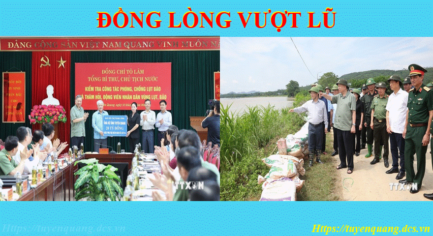Cấp ủy, chính quyền tỉnh và các sở ban ngành tỉnh, các huyện thành phố đã ban hành các Quyết định, Công điện, Văn bản lãnh đạo, chỉ đạo công tác phòng ngừa, ứng phó, khắc phục hậu quả mưa, lũ, lụt, sạt lở đất do hoàn lưu cơn bão số 3 và tình hình xả lũ các công trình thuỷ điện trên địa bàn tỉnh theo đúng phương châm"bốn tại chỗ"; nhờ chỉ đạo kịp thơi, chủ động thông tin, tuyên truyền dự báo, cảnh báo diễn biến tình hình thời tiết, mưa lũ. mực nước, chủ động có biện pháp ứng phó hạn chế thấp nhất thiệt hại về Người và tại sản của Nhân dân. Đoàn công tác của Tổng Bí thư, Chủ tịch nước Tô Lâm và Ban Bí thư Trung ương Đảng kiểm tra, công tác lãnh đạo, chỉ đạo phòng, chống thiên tai, khắc phục hậu quả do mưa, lũ gây ra trên địa tỉnh Tuyên Quang, thể hiện sự quan tâm sâu sắc của Đảng, Nhà nươc s và cá nhân Tổng bí thư, Chủ tịch nước đối với Nhân dân các dân tộc Tuyên Quang. Những ngày vừa qua, nhiều đoàn công tác của các ban, bộ, ngành, cơ quan Trung ương, các tỉnh, thành phố; các đồng chí lãnh đạo tỉnh, các tổ chức, cá nhân thiện nguyện đã có nhiều hoạt động tập trung cho cơ sở, hướng về Nhân dân vũng bị ngập lụt, hỗ trợ kinh phí khắc phục thiệt hại, thăm hỏi, tặng quà, giúp đỡ Nhân. Tỉnh đã chỉ đạo huy động khoảng 8.000 người, trong đó lực lượng quân đội, công an là nòng cốt và các phương tiện, trang thiết bị thực hiện tham gia khắc phục các thiệt hại do hoàn lưu cơn bão số 3 và xả lũ trên địa bàn tỉnh, giúp Nhân dân ổn định cuộc sống, sinh hoạt trở lại nhịp sống bình thường ngay sau khi nước rút. Uỷ ban Mặt trận tổ quốc Việt Nam tỉnh, Uỷ ban Mặt trận tổ quốc Việt Nam huyện, thành phố, Hội chữ thập đỏ tỉnh đã tiếp nhận 27.667 triệu đồng tiền mặt và trên 228 tấn nhu yếu phẩm để hỗ trợ cho Nhân dân bị ảnh hưởng bởi thiên tai.