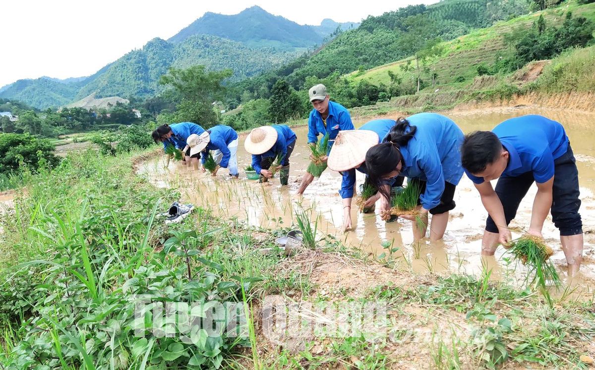 Đoàn viên, thanh niên xã Xuân Lập (Lâm Bình) hỗ trợ gia đình có con tại ngũ cấy lúa đúng khung thời vụ.