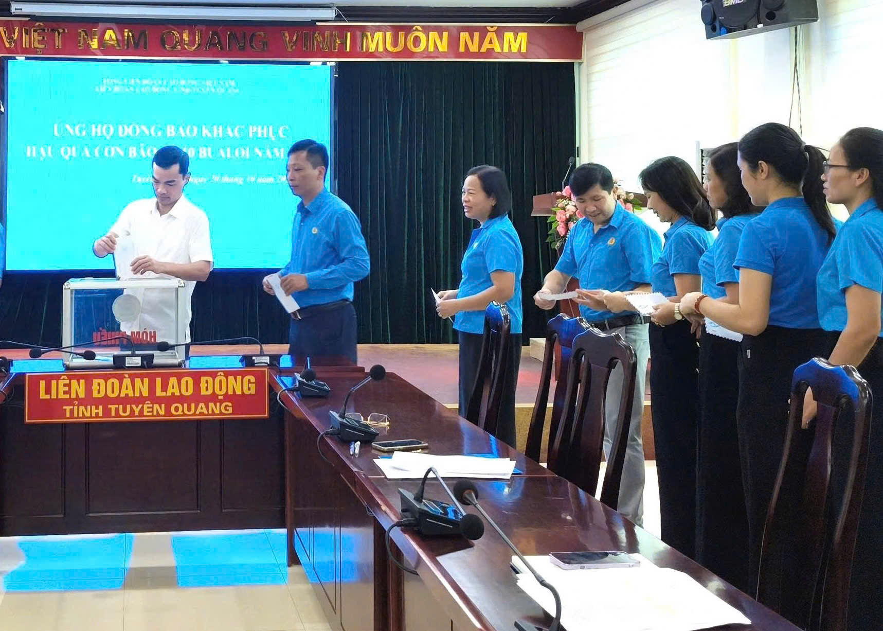 Hưởng ứng Lời kêu gọi của Uỷ ban MTTQ Việt Nam tỉnh Tuyên Quang về việc ủng hộ Nhân dân khắc phục hậu quả do thiên tai do cơn bão số 10 gây ra, chiều ngày 20/10/2025, Liên đoàn Lao động tỉnh tổ chức phát động cán bộ, công chức, người lao động quyên góp ủng hộ, mức tối thiểu mỗi người 1 ngày lương trở lên. Kết quả sau khi phát động, số tiền ủng hộ được 10.650.000đ và số tiền ủng hộ sẽ được chuyển đến Uỷ ban MTTQ Việt Nam tỉnh Tuyên Quang.