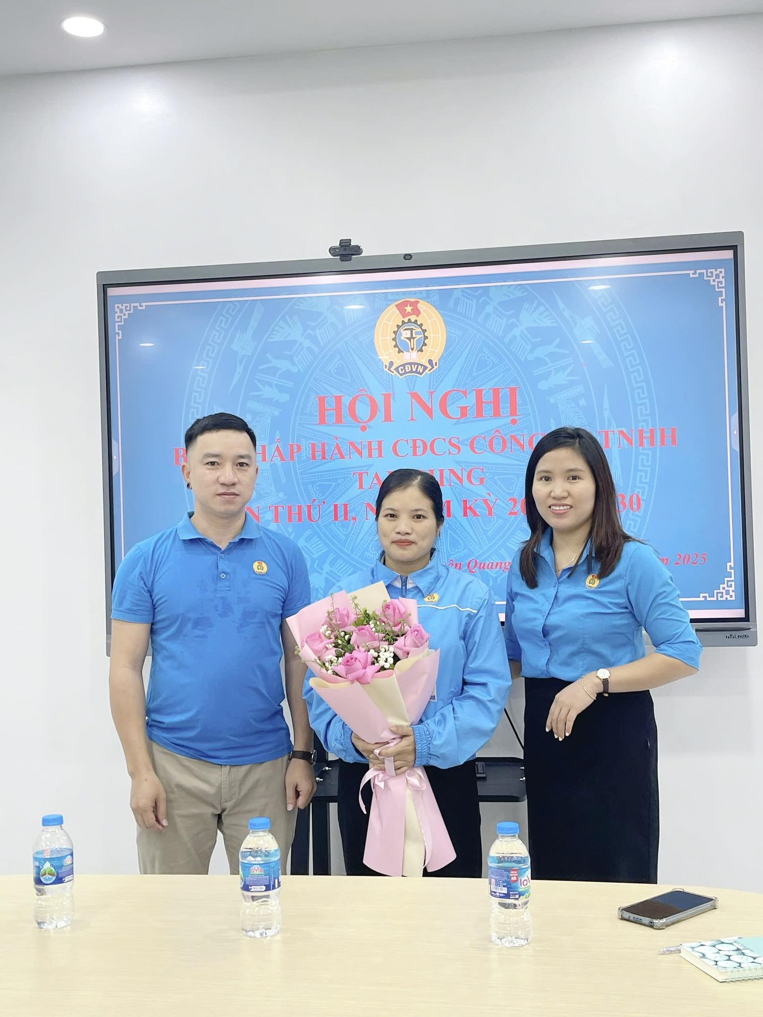 Tại Hội nghị, Ban Chấp hành Công đoàn cơ sở Công ty TNHH Tai Shing đã công bố các Quyết định của Liên đoàn Lao động tỉnh, chỉ định BCH CĐCS Công ty TNHH Tai Shing khóa II, nhiệm kỳ 2025–2030, gồm 13 Đồng chí có năng lực, uy tín và tâm huyết với phong trào công đoàn, Ban Thường vụ gồm 03 Đ/c và Uỷ ban kiểm tra CĐCS gồm 03 Đồng chí.