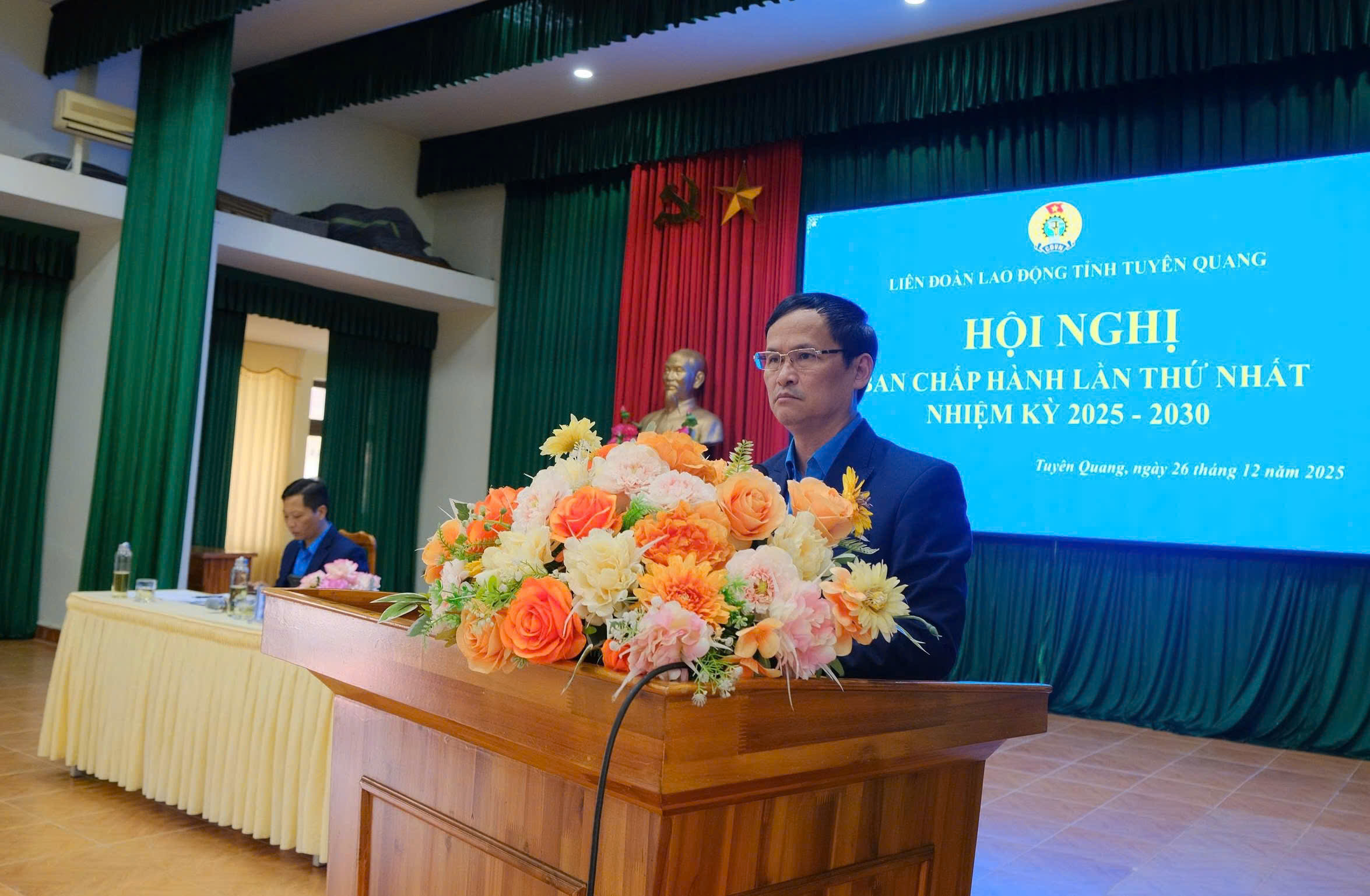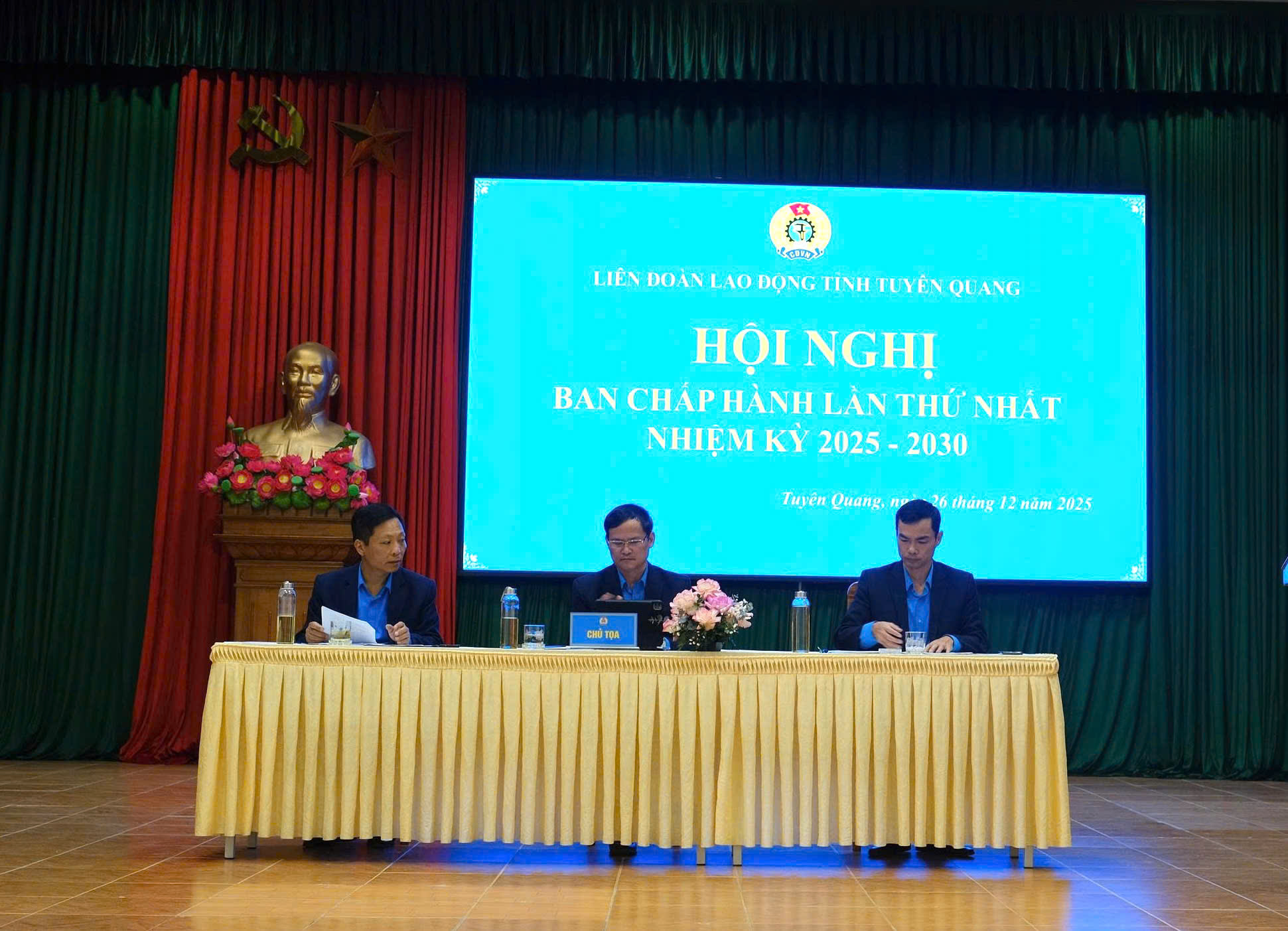 Ngày 26/12/2025, Liên đoàn Lao động tỉnh tổ chức Hội nghị Ban Chấp hành Liên đoàn Lao động tỉnh lần thứ nhất, nhiệm kỳ 2025-2030. Dự hội nghị có đồng chí Ma Thế Hồng, Phó Bí thư Tỉnh ủy, Chủ tịch Ủy ban MTTQ Việt Nam tỉnh; đồng chí Nguyễn Văn Hưng, Phó trưởng Ban Tuyên giáo và Dân vận Tỉnh ủy; các đồng chí lãnh đạo các sở, ban, ngành; các đồng chí ủy viên Ban Chấp hành, Ủy ban Kiểm tra Liên đoàn Lao động tỉnh, lãnh đạo các công đoàn xã, phường, CĐCS doanh nghiệp và cán bộ, công chức Ban Công tác Công đoàn… Hội nghị Ban Chấp hành Liên đoàn Lao động tỉnh lần thứ nhất thông qua 4 nội dung dự thảo: Quyết định ban hành Quy chế làm việc của Ban Chấp hành Liên đoàn Lao động tỉnh Tuyên Quang khoá I, nhiệm kỳ 2025-2030; Quyết định phân công nhiệm vụ các đồng chí Thường trực, Uỷ viên Ban Thường vụ, Uỷ viên Ban Chấp hành Liên đoàn Lao động tỉnh Tuyên Quang khoá I, nhiệm kỳ 2025-2030; Chương trình làm việc toàn khoá của Ban Chấp hành Liên đoàn Lao động tỉnh Tuyên Quang khoá I, nhiệm kỳ 2025-2030; Dự thảo Chương trình công tác kiểm tra giám sát toàn khoá của Ban Chấp hành Liên đoàn Lao động tỉnh Tuyên Quang khoá I, nhiệm kỳ 2025-2030.