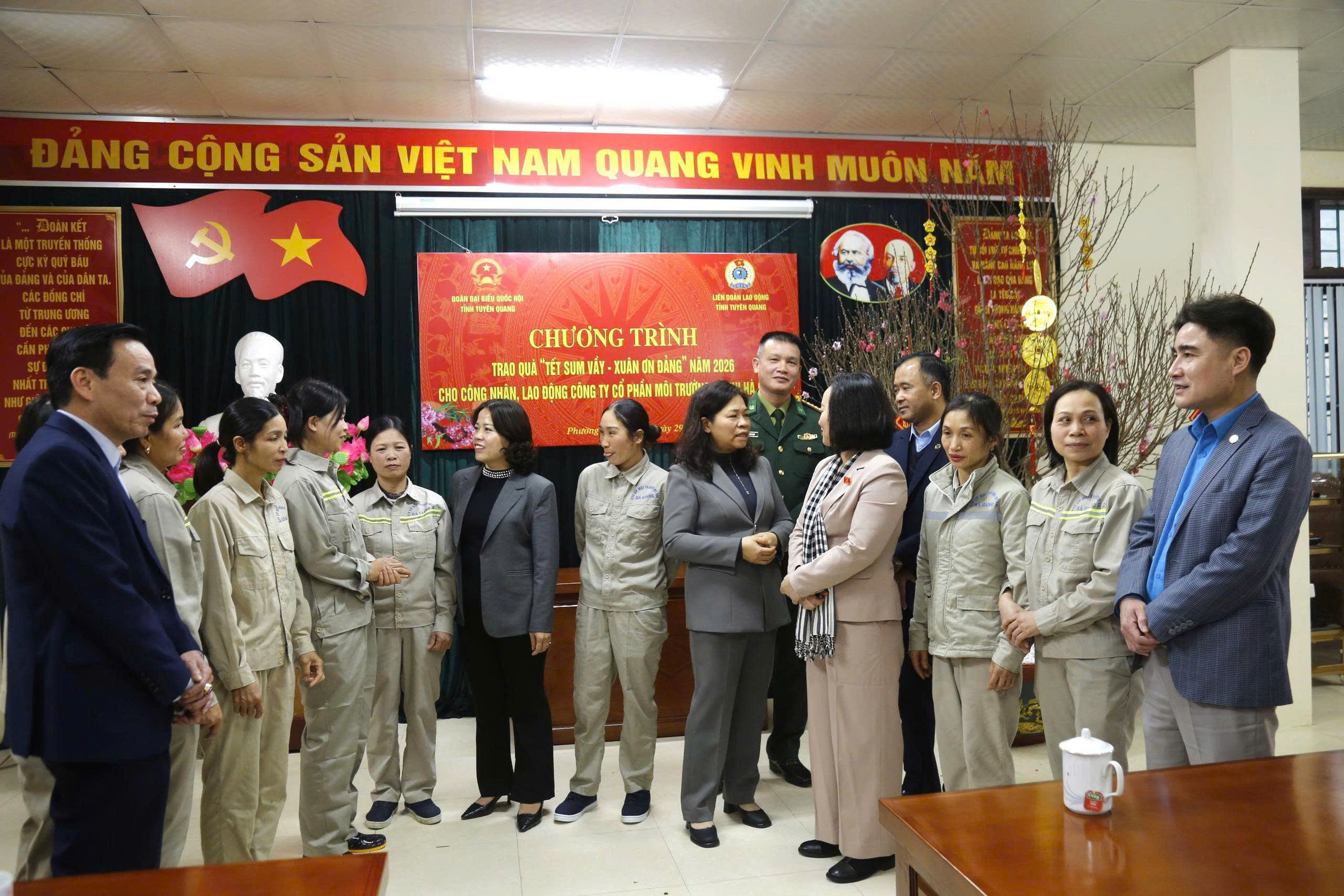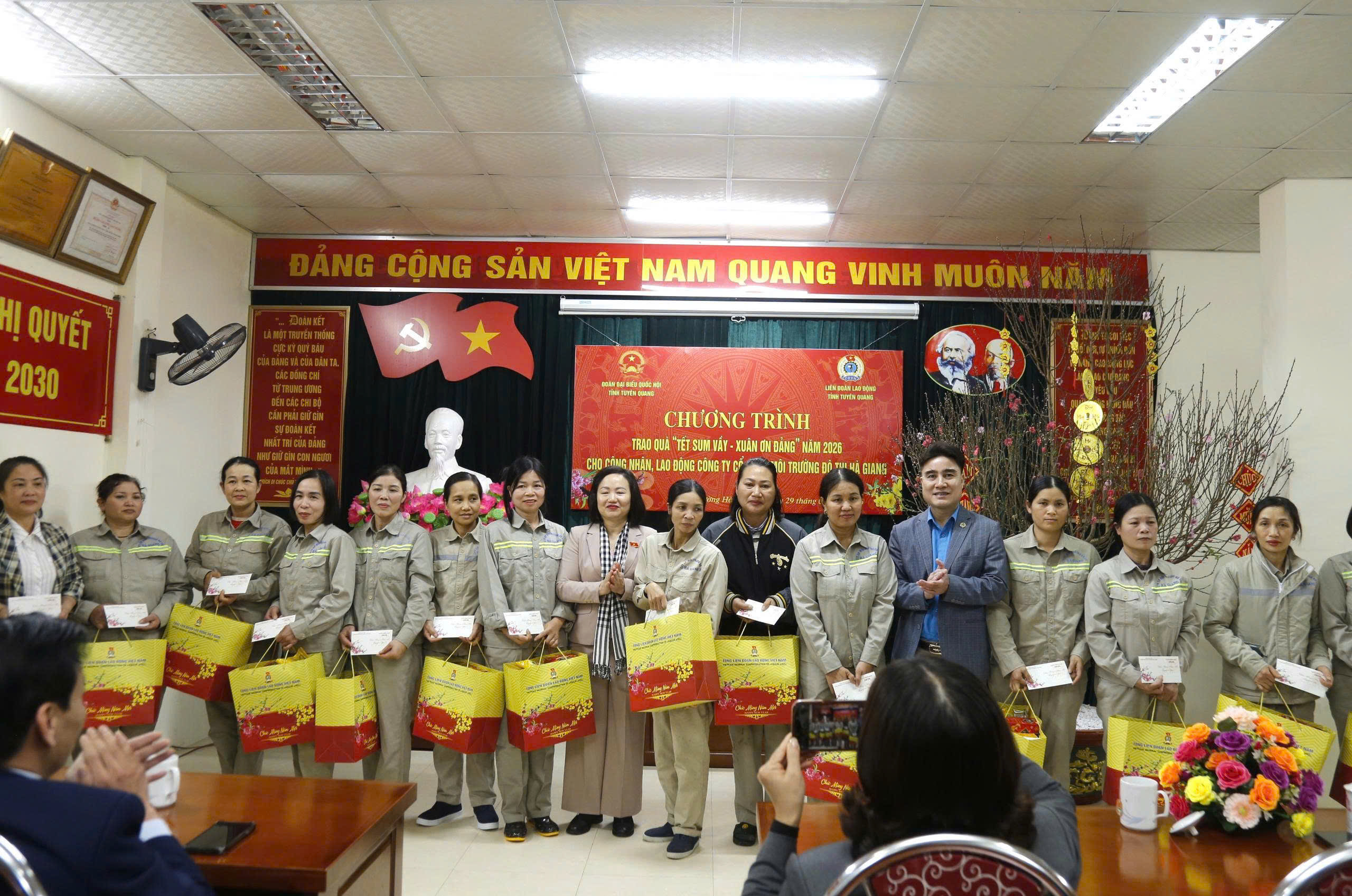 Ngày 28/01/2026, các đồng chí Lãnh đạo Đảng, Nhà nước đã đến thăm hỏi, chúc Tết và tặng quà cho 100 đoàn viên công đoàn, công nhân lao động thuộc Công đoàn cơ sở Công ty cổ phần Môi trường Đô thị Hà Giang nhân dịp Tết Nguyên đán Bính Ngọ 2026, mỗi đoàn viên, người lao động được nhận một suất quà trị giá 1 triệu đồng tiền mặt và một túi quà.