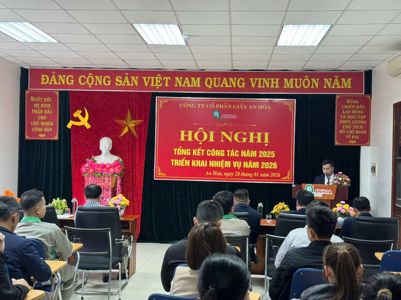 Ngày 28/01/2026, Công đoàn cơ sở Công ty cổ phần Giấy An Hòa tổ chức Hội nghị tổng kết công tác năm 2025; triển khai nhiệm vụ năm 2026; khen thưởng các tập thể, cá nhân có thành tích xuất sắc trong Công tác năm 2025. Dự Hội nghị có ông Bùi Tuấn Anh - Tổng Giám đốc Công ty; ông Hoàng Minh Sơn - Bí thư Đảng ủy, Giám đốc Hành chính nhân sự; Giám đốc các Khối; Lãnh đạo các Phòng, Phân xưởng trong Công ty; các đồng chí Ủy viên Ban Chấp hành Đảng bộ, Công đoàn và các đồng chí được khen thưởng năm 2025…