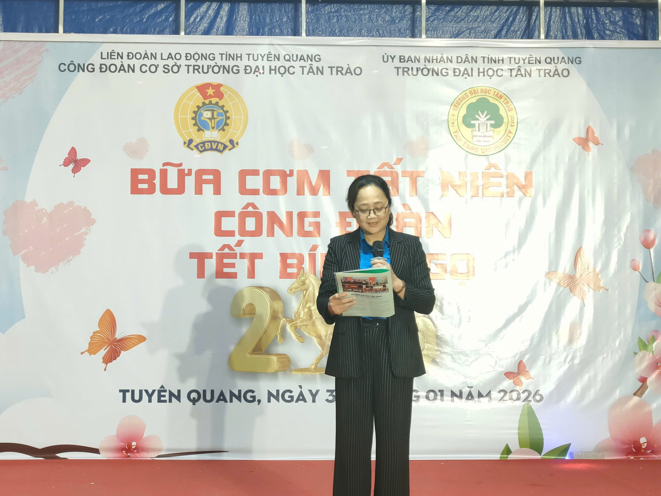 Phát biểu tại chương trình, đồng chí Nguyễn Thuý Nga - Phó Chủ tịch Công đoàn trường đã gửi lời chúc mừng năm mới và biểu dương những nỗ lực, đóng góp của đội ngũ công đoàn viên trong suốt năm qua; đồng thời bày tỏ mong muốn tập thể Công đoàn Trường Đại học Tân Trào tiếp tục phát huy tinh thần đoàn kết, sáng tạo, đồng hành cùng Nhà trường hoàn thành tốt các nhiệm vụ trong năm mới 2026.