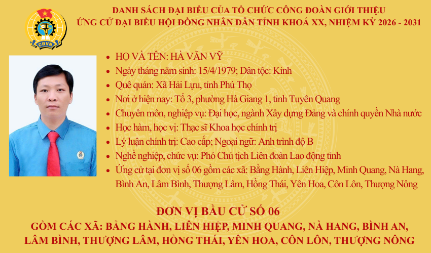 Đồng chí Hà Văn Vỹ, Phó Chủ tịch LĐLĐ tỉnh ứng cử đại biểu Hội đồng nhân dân tỉnh Tuyên Quang khoá XX, nhiệm kỳ 2026 – 2031