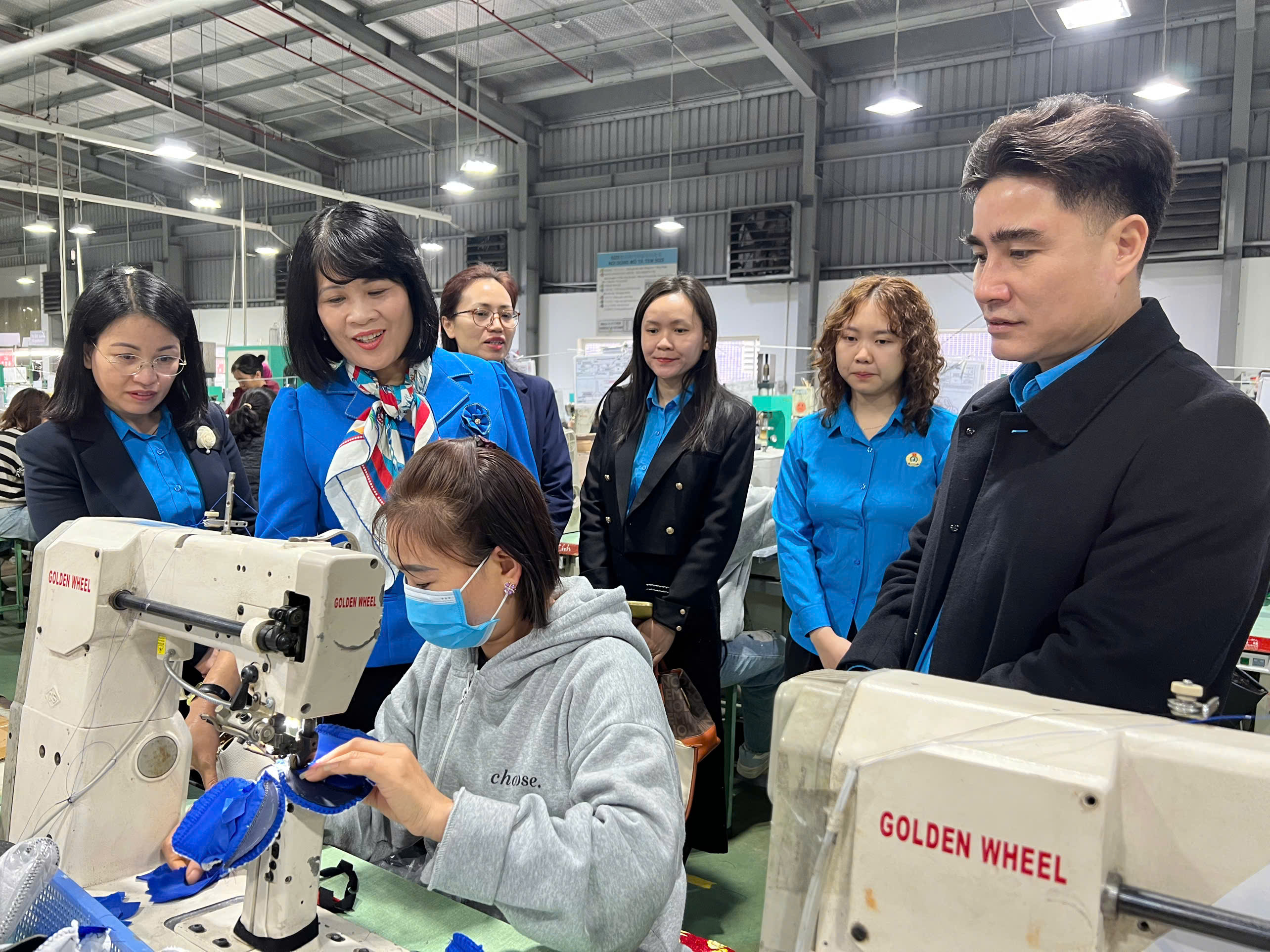 Lãnh đạo Ban Quan hệ lao động Tổng LĐLĐ Việt Nam và Thường trực LĐLĐ tỉnh thăm dây chuyền sản xuất của Công ty TNHH Sản xuất Giầy Chungjye Tuyên Quang
