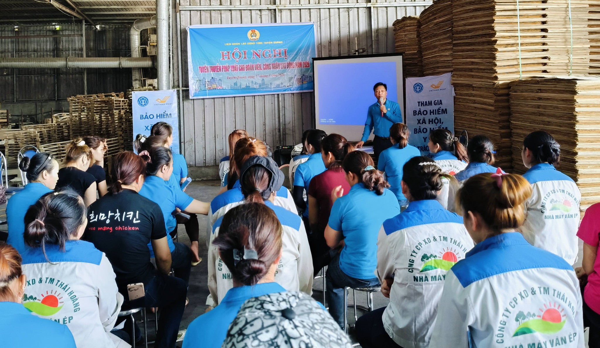 Ngày 27/3/2026, tại Công ty Cổ phần XD&TM xuất nhập khẩu Thái Hoàng (Khu công nghiệp Nam Quang), xã Vĩnh Tuy, Liên đoàn Lao động tỉnh Tuyên Quang đã phối hợp tổ chức hội nghị tuyên truyền, phổ biến pháp luật cho đoàn viên, công nhân lao động trong doanh nghiệp.